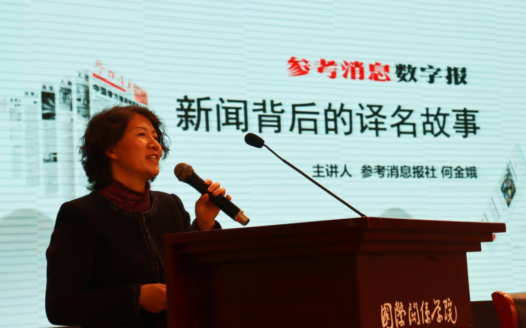 《参考消息》译名室主任何金娥向同学们分享了外语名称在中文译写过程中的有趣案例,让同学们在轻松愉悦的氛围中学习了中文译名的知识,使同学们大开眼界。