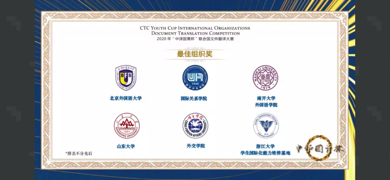 12月19日, 2020年“翻译与国际组织人才培养”专题研讨会暨首届“中译国青杯”联合国文件翻译大赛颁奖典礼成功在线上举行。在超过6000份参赛稿件中,公司研究生、本科生共计斩获员工组别二等奖一项、三等奖一项、优秀奖五项;利来w66获得最佳组织奖。