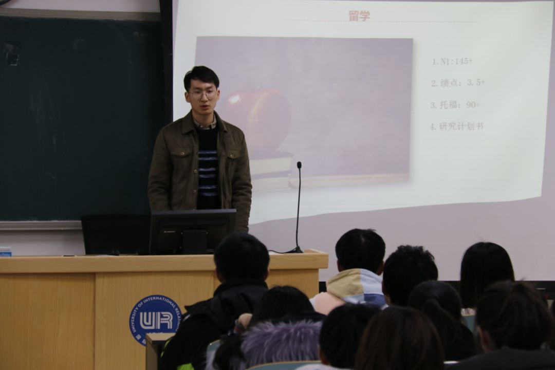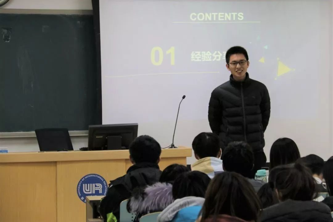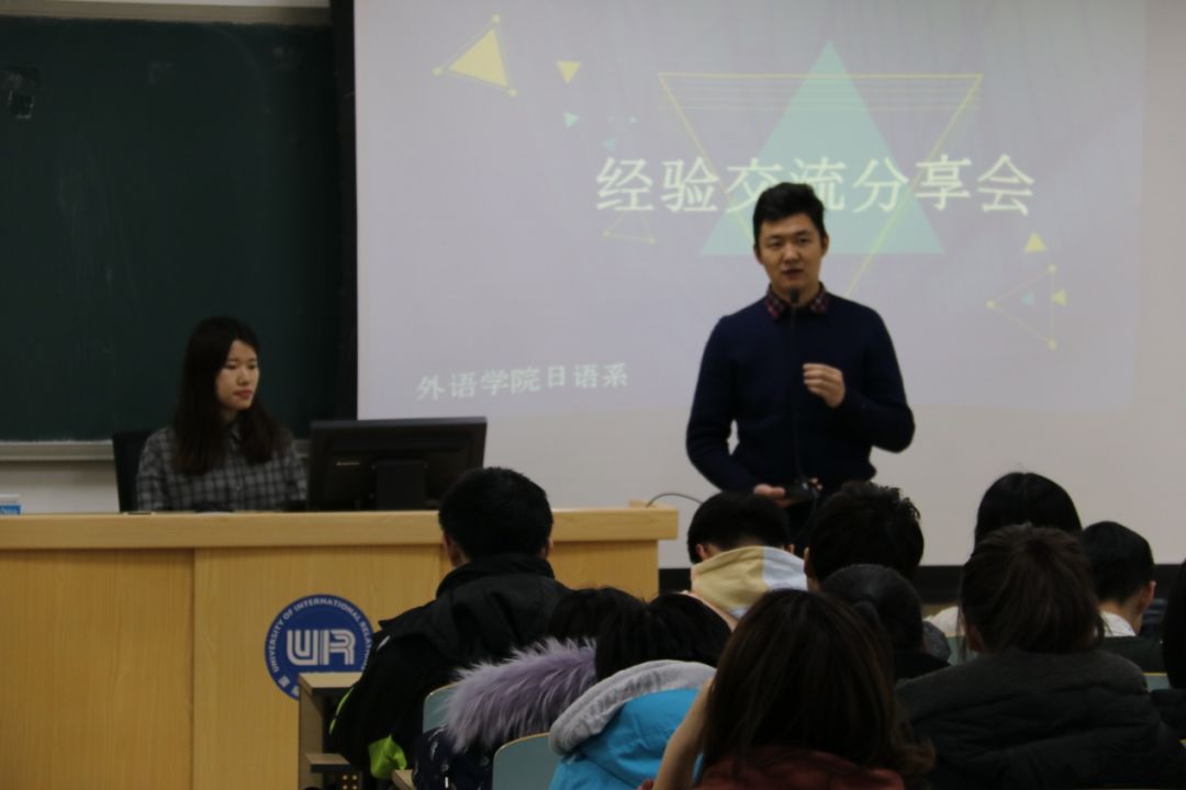 之后,齐宇轩同学向大家分享在大学中取得优异成绩的经验。在外语学习中,单词是最基本的功课,即便琐碎,我们也要认真对待,来打好学习外语的基础。同时,外语学习还要做到严谨与认真,我们做的是一种工匠精神,外语的阅读与翻译有着自己的特殊影响,细心与严谨是我们必须做到的要求,不论是在学习中还是在实际操作中。学长还分享了留学的意义,国关的留学机会较多,我们应当抓住这个机会,因为使用外语是学习外语的重要途径。除了本科中的外教课程,留学更是我们使用日语的重要途径。学长也对自己成功保研的经验进行了分享,保研需要的是耐心,我们三年中要坚持努力,让自己排名保持在年级前列,这需要学好每一门课程,不论它是不是专业课。在坚持三年后,如果保研外校,还需要面对来自其他公司优秀员工的竞争压力。学习是大学的主旋律,我们一定要做好员工的本职工作。