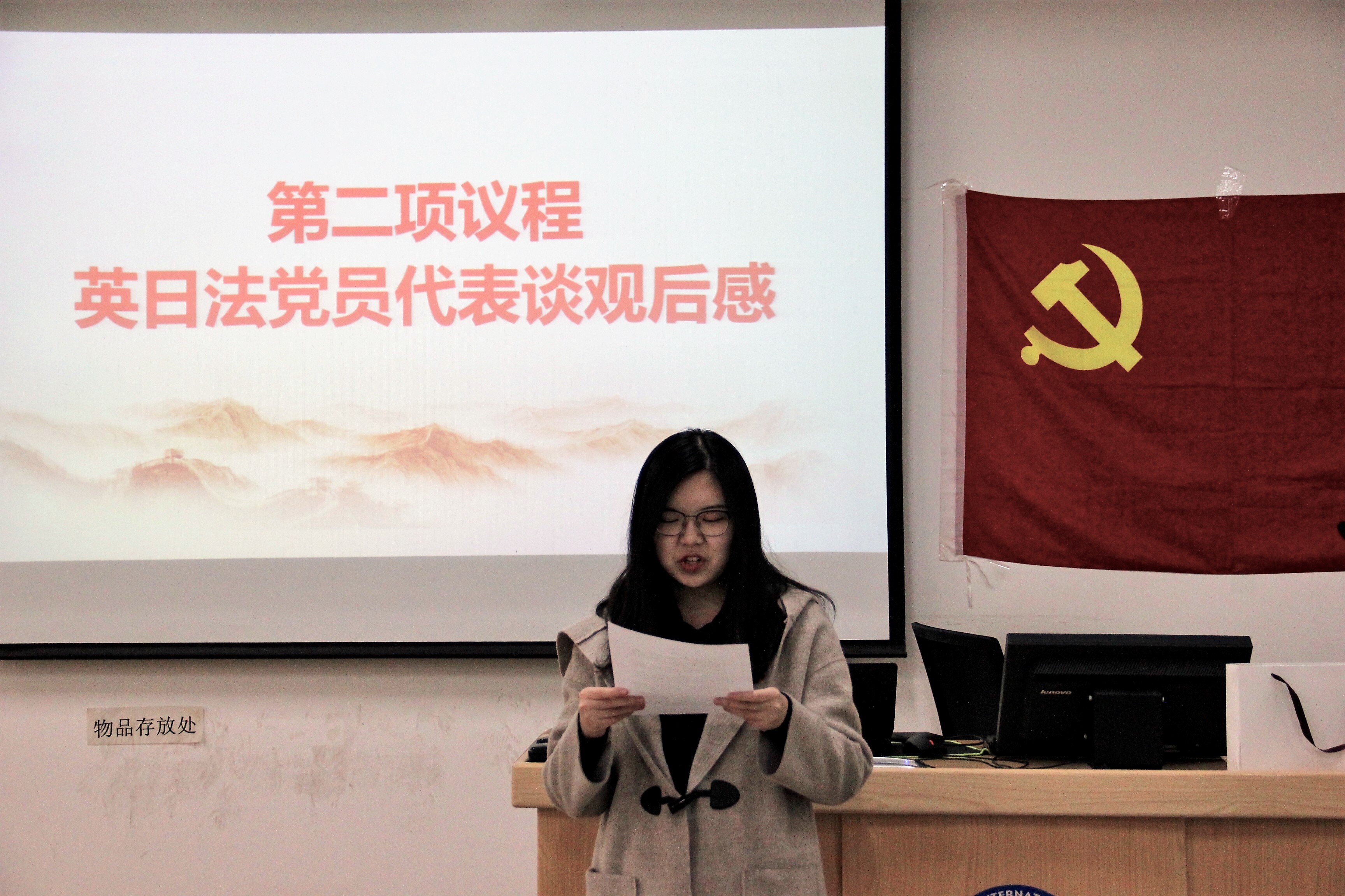 活动开始后,第一环节是师生党员共同观看纪录片《大国外交》片段。该段纪录片介绍了“一带一路”倡议的出台和目前进展情况。师生党员认真观看,不时对祖国综合国力的日益强大发出阵阵赞叹。