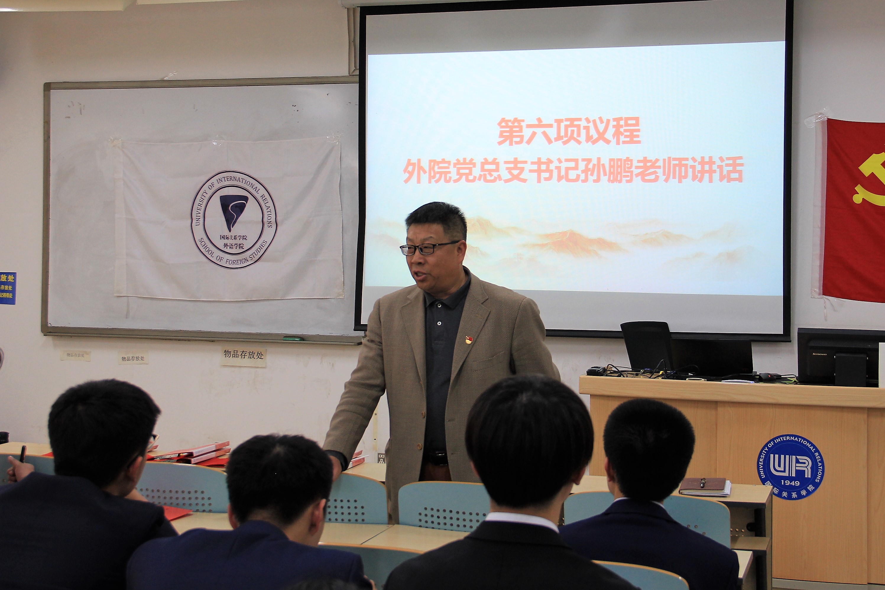 活动开始前,孙鹏老师致辞,指出本次主题党日活动是外公司党总支紧密结合庆祝建国70周年和建校70周年的主题,立足校情实际、突出国关特色,经过精心策划得以推出的。外公司党总支紧扣主题、自主设计、自主呈现、全员参与、全员观摩,共同保障系列活动顺利开展。