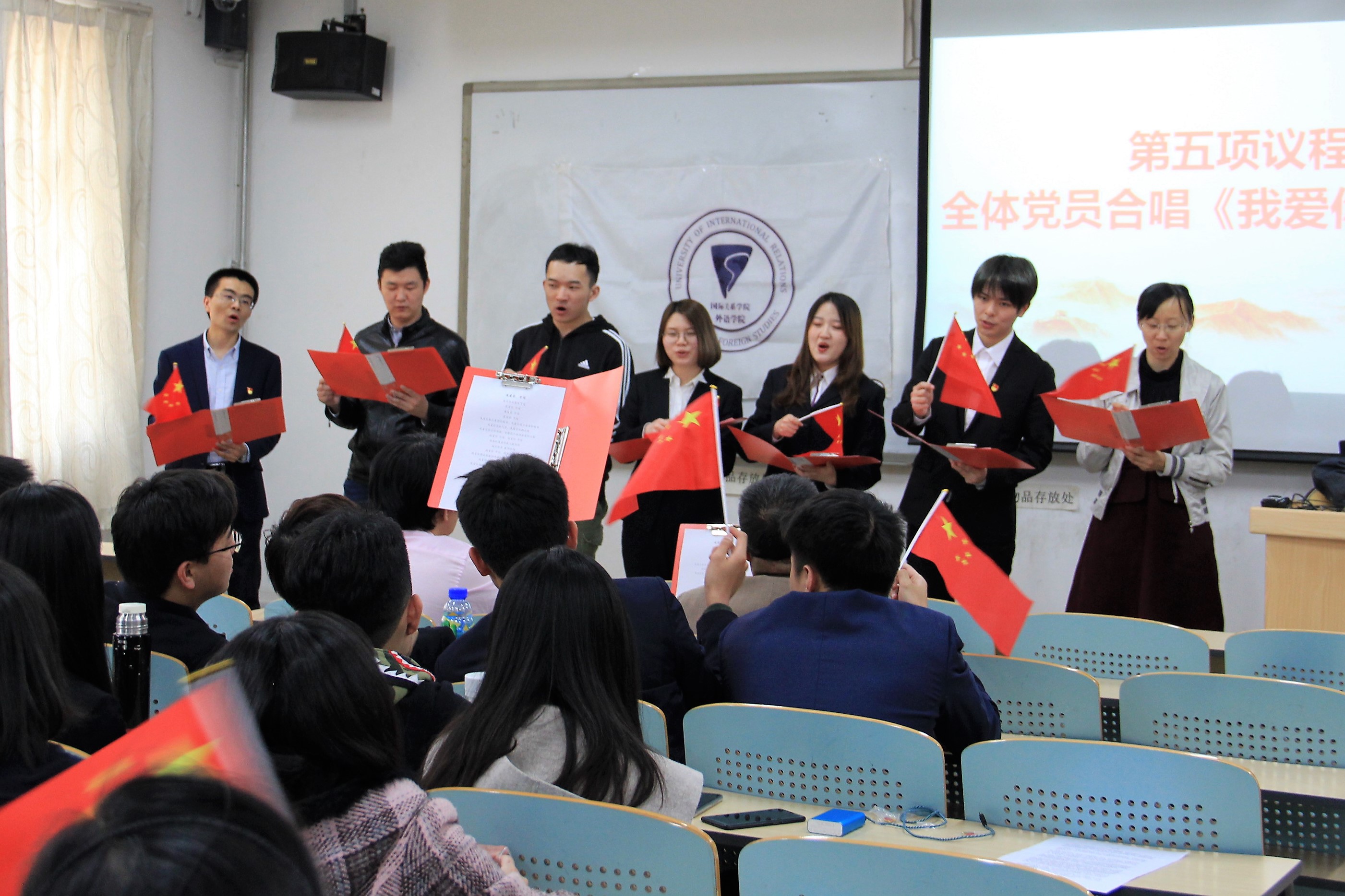 第五环节为全体党员合唱《我爱你中国》,英语系2016级员工党员杨策进行现场吉他伴奏,全体师生共同参与。在饱含深情的歌声感染下,师生纷纷挥舞起手中的国旗,将活动现场气氛推向高潮。