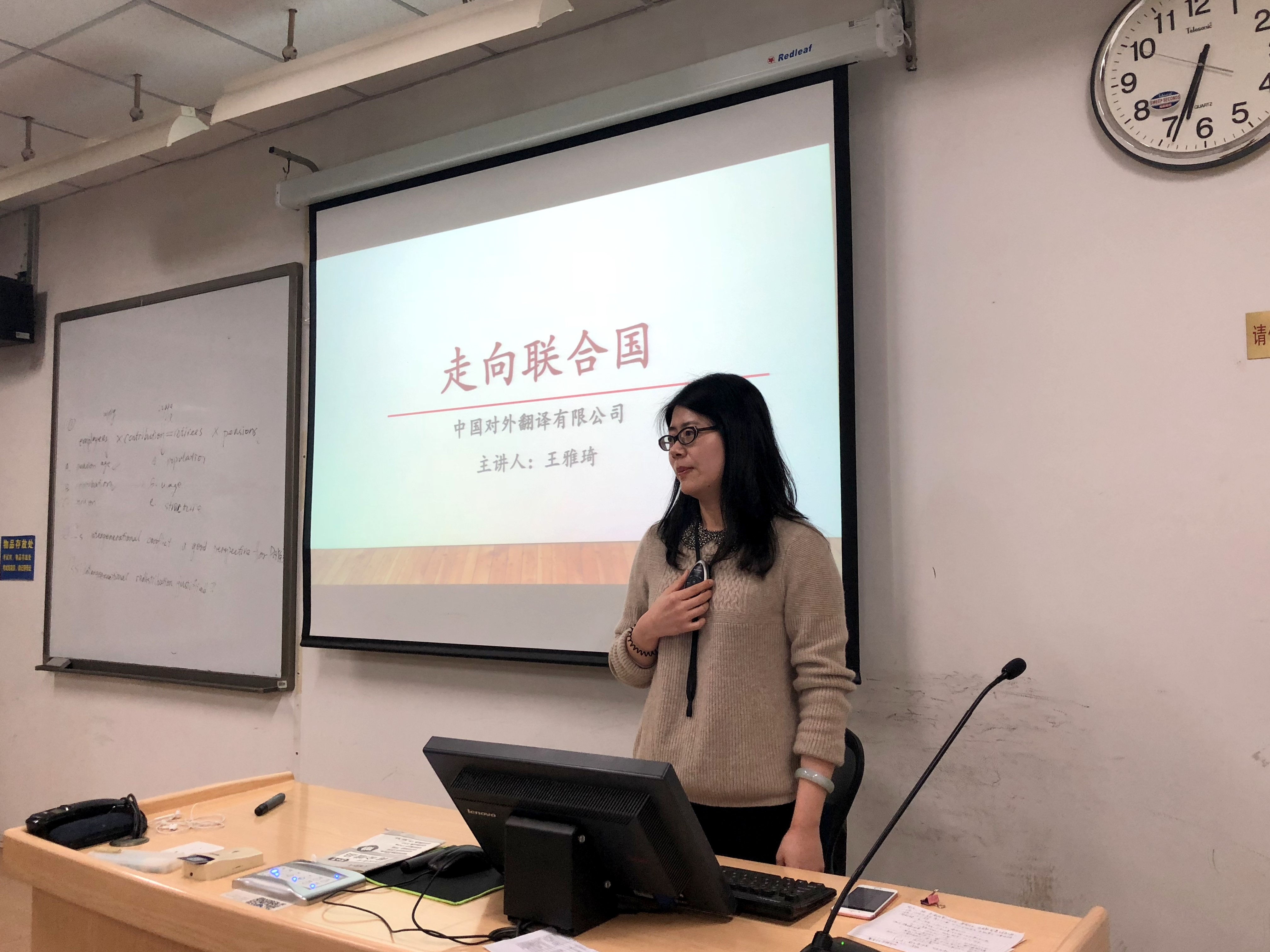 王雅琦老师从如何激发翻译兴趣入手,同大家分享了派驻维也纳办事处等机构从事翻译的工作经历。王老师还带领同学们亲身体验了联合国文件翻译的特点、体例、术语等要求。最后,王老师介绍了目前翻译市场和培训市场的现状。