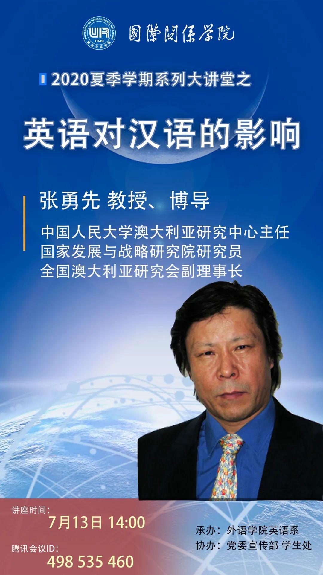 “英语对汉语的影响”包括词汇、语法、语音三个方面。通过词汇、语法和语音方面的大量例证,本次讲座将展现英语对汉语的全方位影响。文化交流离不开语言,而语言是相互影响的。为什么英语对汉语的影响更大?同时,我们应该考虑这样的问题:英语对汉语的深刻影响最终会产生什么结果?