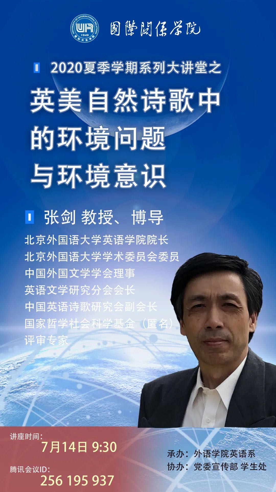 张剑,北京外国语大学英语公司经理、教授、博士生导师。北京外国语大学学术委员会委员,中国外国文学学会理事、英语文学研究分会会长,中国英语诗歌研究会副会长,国家哲学社会科学基金(匿名)评审专家。主要研究领域为英美诗歌和中外文学关系。曾主持教育部留学回国人员科研启动基金和国家社科基金等重要科研项目。曾任教育部考试中心研究生入学考试命题组专家和联合国教科文组织总部中文科翻译,主讲国家级精品课程“英语文学概论”。