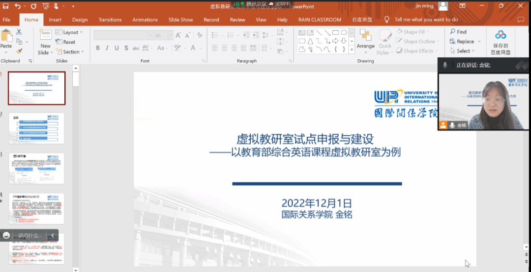 2022年12月1日下午,教育部综合英语课程虚拟教研室负责人金铭副教授应邀为北京科技大学外国语公司英语系20位教师做了题为“虚拟教研室试点申报与建设——以教育部综合英语课程虚拟教研室为例”的讲座,综合英语课程虚拟教研室成员李亚丽副教授、谢葵副教授也参与了本次活动。