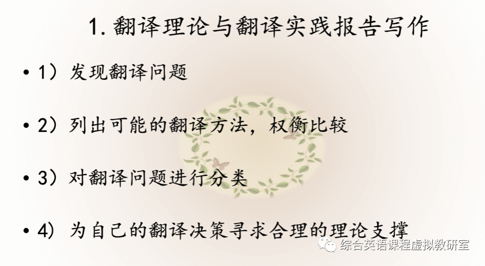在第三部分,高佳艳老师谈及翻译问题的具体分类以及主要的翻译理论流派,并重点介绍了约翰·坎尼森·卡特福德(J. C. Catford)、尤金·奈达(Eugene A. Nida)、彼得·纽马克(Peter Newmark)、韩礼德(M.A.K. Halliday)、汉斯·弗米尔(Hans J. Vermeer)、克里斯蒂娜·诺德(Christine Nord)等学者的理论和应用实践。
