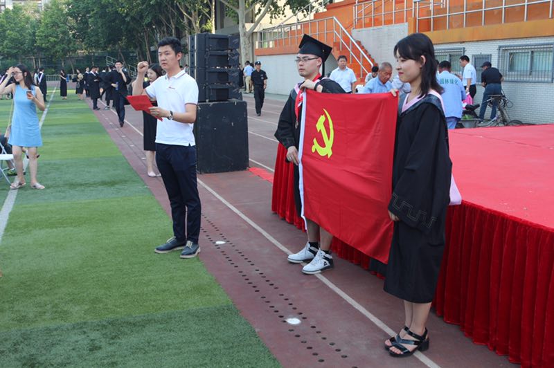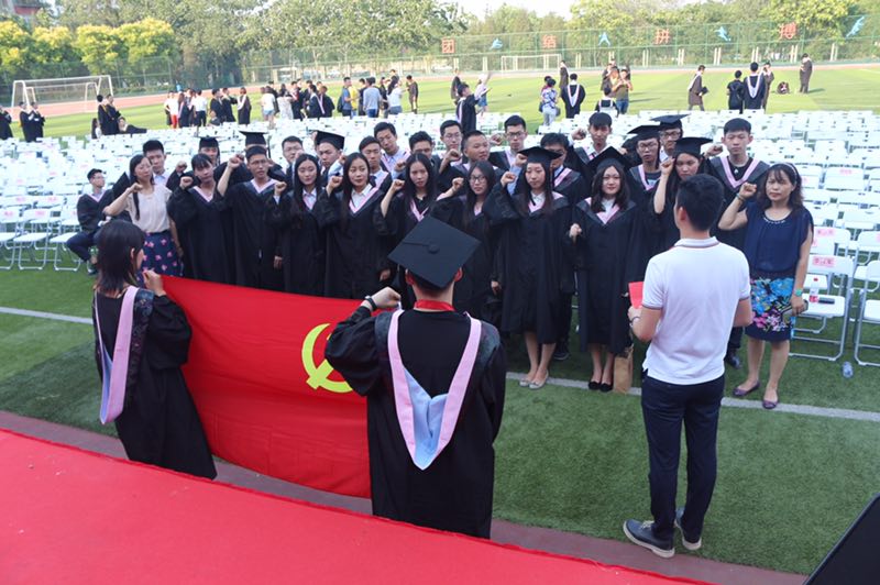 在明媚的阳光下,身着学士服的毕业生们举起他们的右手,面对党旗进行庄严的宣誓,表达自己对党的忠诚。