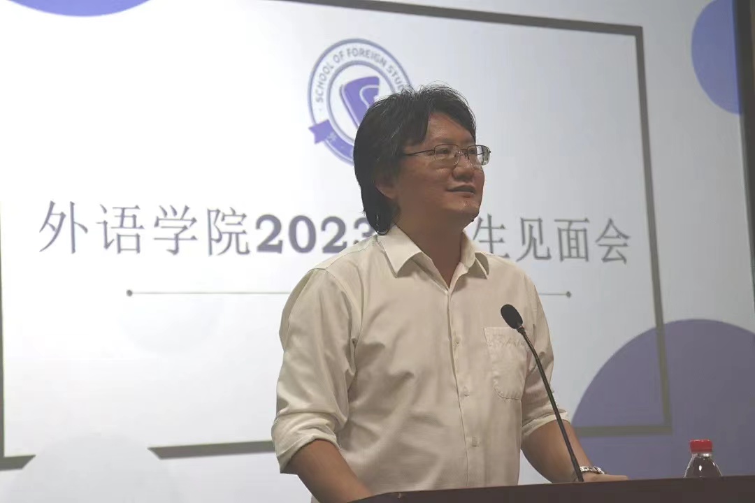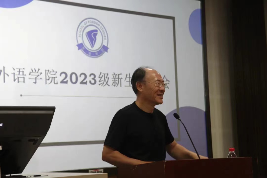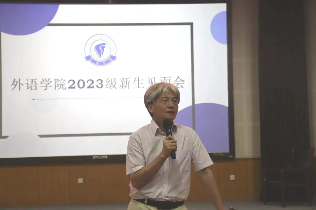 英语系2023级新生见面会上,王文华老师介绍了英语系各位老师。他深情寄语全体英语新生:“Be better then them,but don't tell them so”。