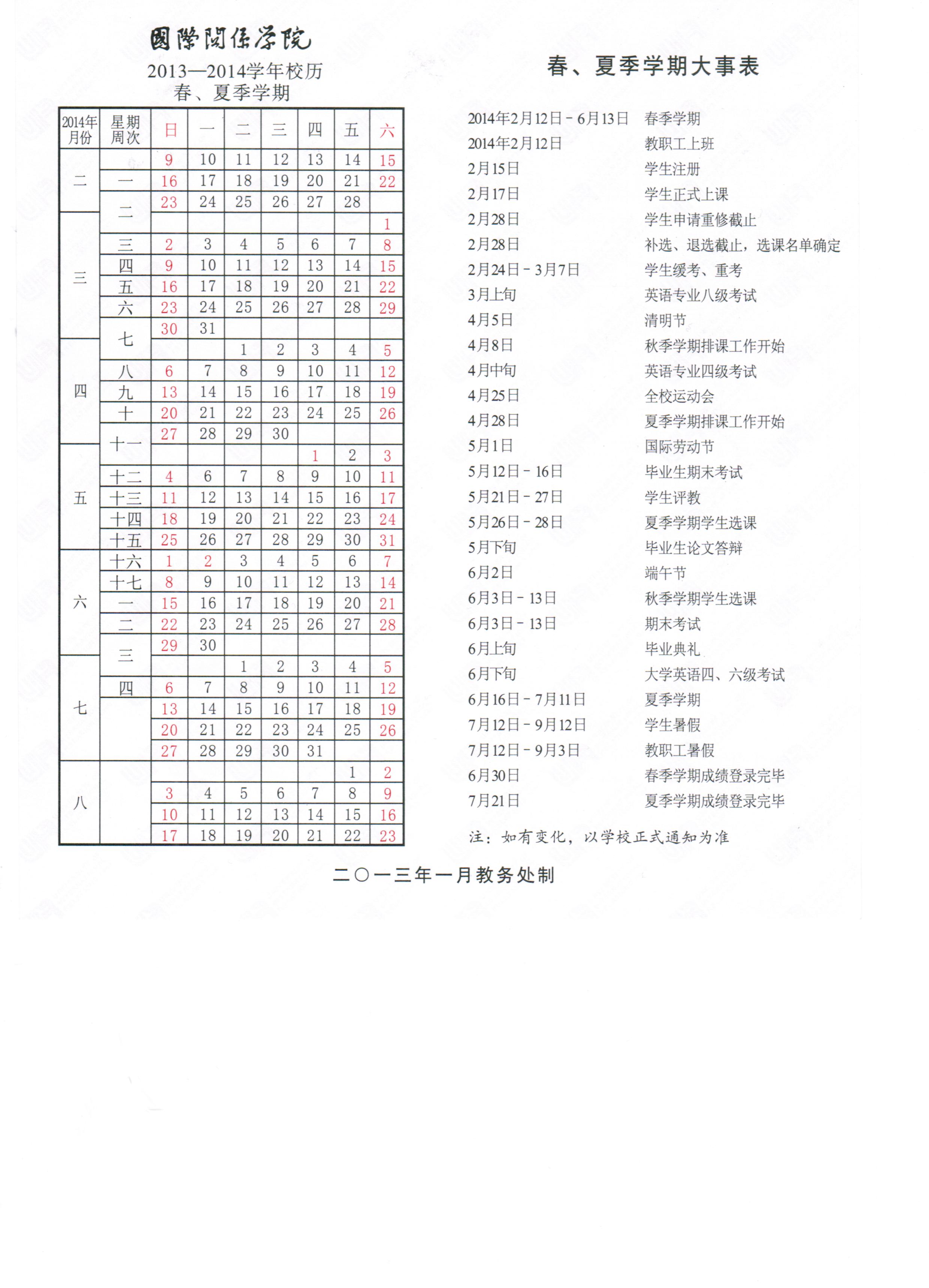 2013 - 2014学年春、夏季学期校历