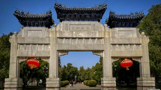 和平保卫坊造型古朴典雅,气势磅礴,矗立在一片葱郁之间。历经风云变幻,终得拨云见日。今天,同学们站在纪念碑之下,满怀敬仰,满心敬意。