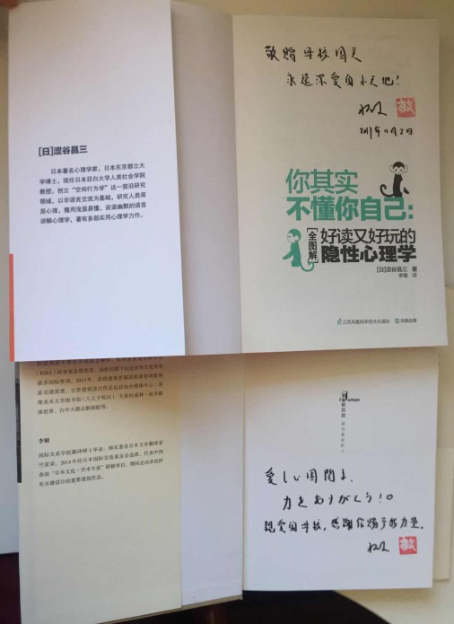 尽管已经毕业三年,但是她始终牢记着在校期间老师们的谆谆教导,做事用心,沉稳扎实。正是凭借在国关求学期间打下的牢固的学识基础以及养成的严谨细致的办事风格,她得以顺利地进入了国内知名的出版社。她利用闲暇时间翻译了《建筑,从那一天开始》与 《你其实不懂你自己:隐性心理学》两本内容很棒的书。在书的扉页上,她分别用日语与汉字写下了对母校的话:“亲爱的母校,感谢你赐予我力量”“敬赠母校国关,永远深爱的小天地”,充分表达了她对母校的热爱与感激之情。她还表示,只要母校有需要,她一定尽力提供协助,体现出国关学子植根于心中的感恩之心与报答母校的心意。