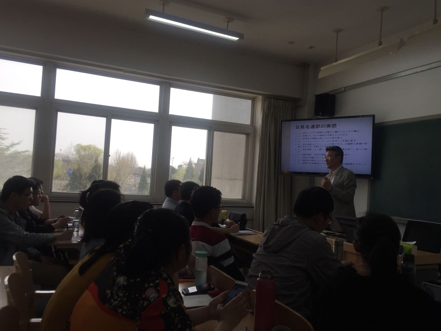 蔡老师在授课过程中,还讲授了口译译员应该具备的素质与能力,即:扎实的语言功底(母语+日语+英语)、强烈的好奇心、较佳的预判力(口译)、快速的学习能力(口译)、合理的知识结构(通才+专才)、出色的忍耐力和毅力、身体素质和健康管理的能力、良好的职业道德。此外,蔡老师还介绍了多个练习的方法,如:每天坚持做一到两次十到十五分钟的跟读;养成每天有日语流过耳旁的习惯,再通过练习发现自己存在的问题;朗读材料30分钟,保持口齿伶俐,反应迅速的状态;提前做好充分准备,学会速找、速看、速记等等。