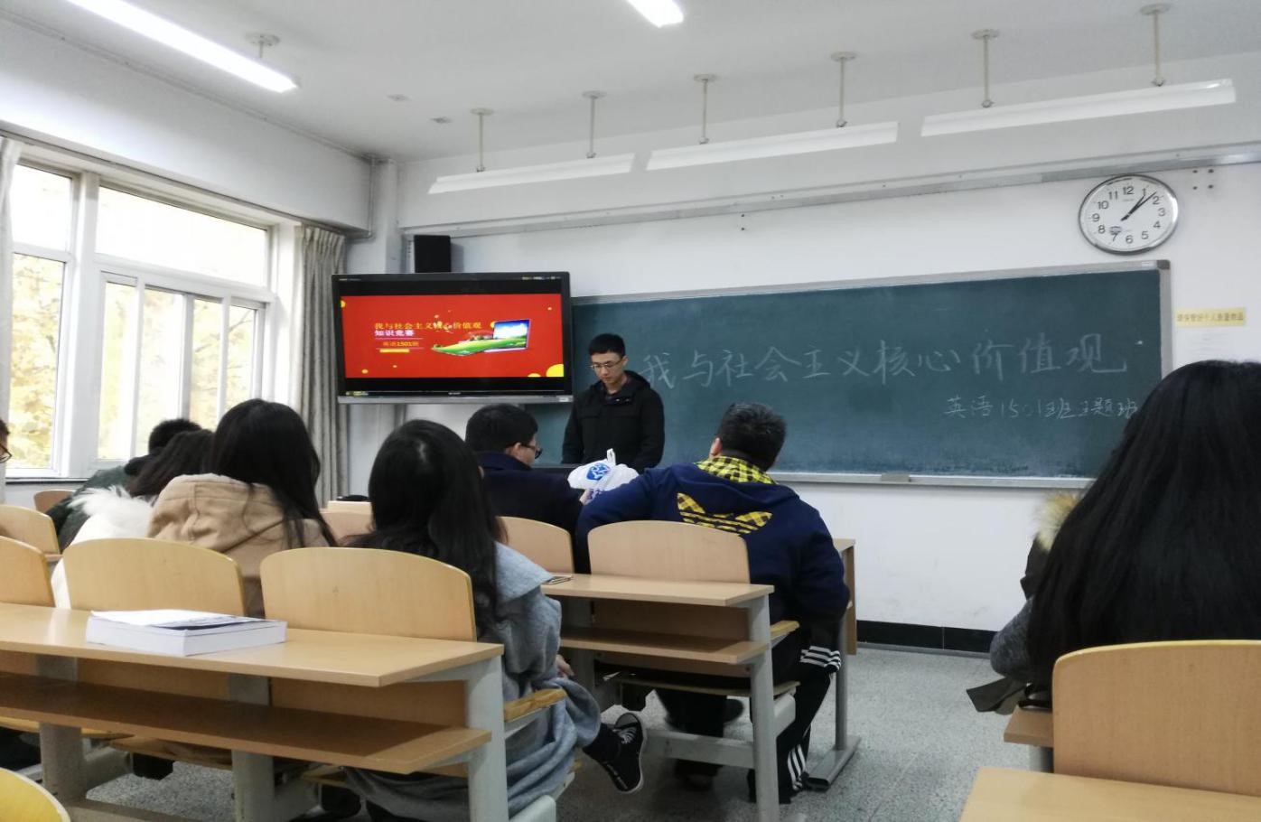 11月9日下午一点,英语1501班开展了“我与社会主义核心价值观主题班会”。在此次班会中,英语1501班采取了知识竞赛形式来开展此次班会。