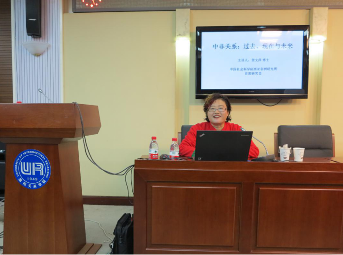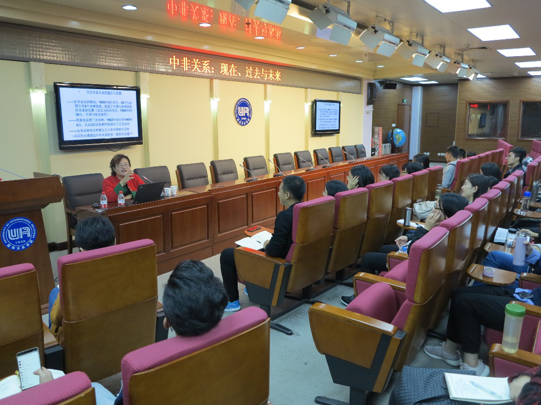 从历史上看,中非之间的交往是和平友善之旅。从古代郑和下西洋到当代亚非会议的召开、周恩来总理三访非洲、坦赞铁路等一系列历史政治大事件中,可以看出中非关系是历史的宝贵遗产。接着,贺老师重点介绍了“中非合作论坛”的六次召开及每次会议取得的实质性成果。她向我们解释到,“论坛”自2000年第一次在北京召开后,每三年轮流在中国和非洲举办,每次会议取得的成果都促使中非关系向更高、更深层次的方向发展。中国对非洲提供资金、技术、人才援助,发展合作项目,同时关心气候变化问题、支持非洲一体化和文化交流。最后,贺老师着眼未来,分析了摆在中非关系面前的机遇与挑战:双方合作趋势不断加强,但在经贸合作和更深入的政治文化层面还需要进一步的沟通和了解。