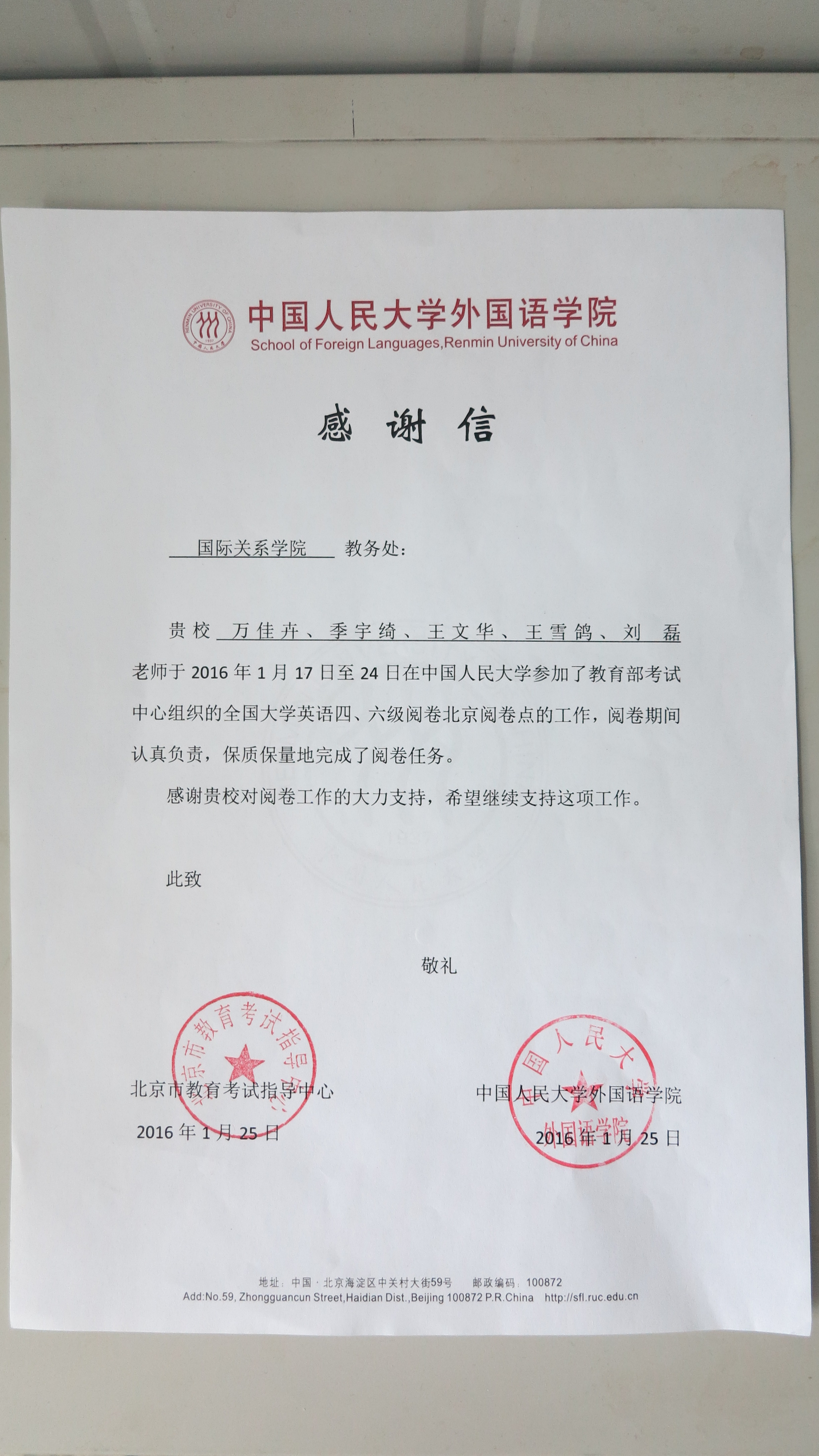 2016年寒假期间,受北京教育考试指导中心的邀请,利来国际王文华、王雪鸽、季宇绮、万佳卉几位老师赴中国人民大学参加了全国老员工英语四、六级阅卷工作。阅卷时间自2016年1月17日至24日,为期八天。期间,各位老师认真负责,兢兢业业,保质保量地完成了阅卷任务。公司教务处收到了来自北京市教育考试中心、中国人民大学外国语公司联合发出的感谢信(详情见附件)。
