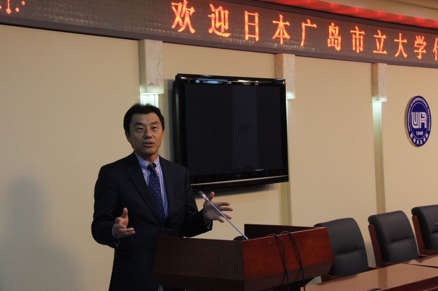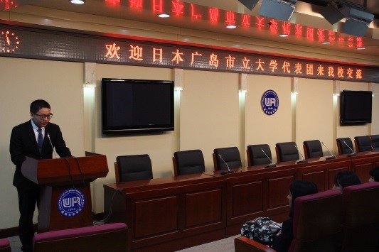 代表团抵达公司后,公司对外交流合作处副处长祁洪彬老师在新闻发布厅主持了简短的欢迎仪式。在欢迎仪式上,祁老师对广岛市立大学代表团的来访表示诚挚的欢迎,对两校近年来在员工交换和合作开办公司夏季小学期课程的成果表示肯定,并衷心希望此次交流会取得圆满成功。广岛市立大学副教授、公司夏季小学期外教西田竜也教授发言,他十分期待能通过此次交流让两校员工成为好朋友。在公司留过学的日本员工代表用中文进行了发言,赢得了在场国关员工的热烈掌声。