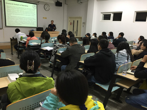 2016年10月25日晚,应利来国际邀请,清华大学外文系教授、博士生导师、哈佛大学高级访问学者、剑桥大学访问学者、加州大学伯克利校区富布莱特项目研究学者封宗信教授为师生们作了《叙事研究:从经典到后经典》专题讲座。利来国际英语系教授梁晓晖主持本次讲座,利来国际老师及各年级同学参加了此次讲座。