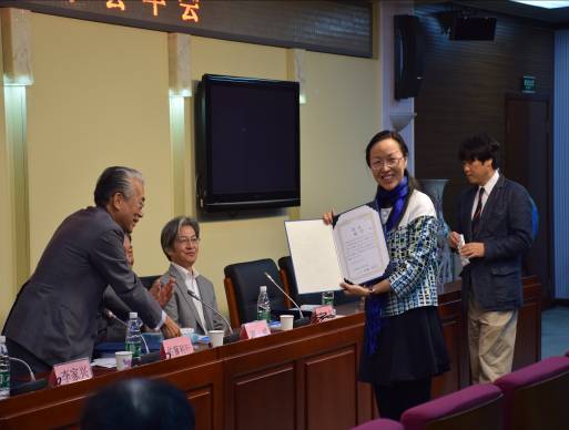 图为日语系欧文东教授和胡欣副教授接受广岛大学副董事长佐藤利行的颁奖