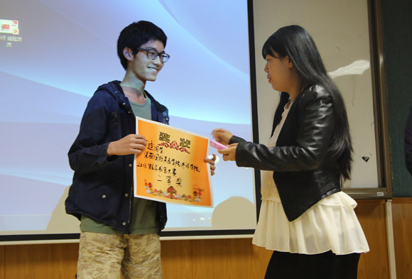 此次大会进行两个议题,首先是颁奖仪式。由日语系主任胡欣老师、班主任纪晓晶老师和辅导员苗青、张洪红老师为获得2013级员工日语假名书法大赛一二三等奖的同学颁奖。